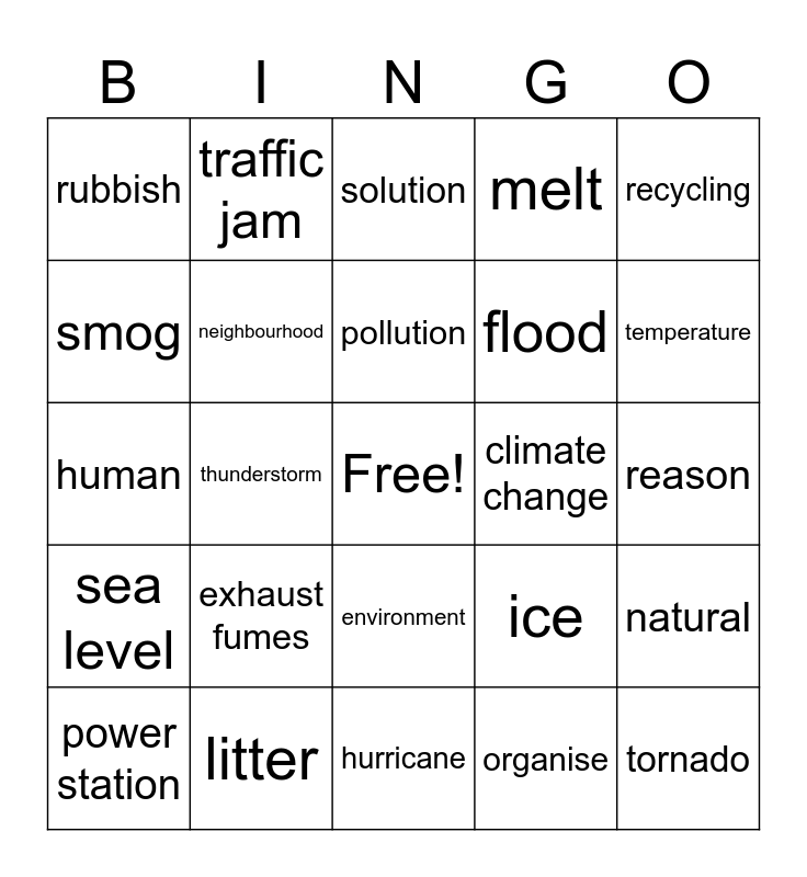 This bingo card has a free space and 24 words: exhaust fumes, litter, pollution, power station, recycling, rubbish, smog, traffic jam, climate change, environment, flood, human, ice, natural, neighbourhood, organise, reason, solution, temperature, thunderstorm, tornado, sea level, melt and hurricane.
