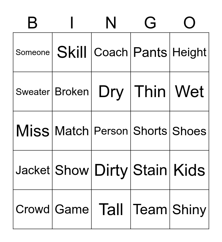 This bingo card has a free space and 39 words: Backpack, Bald, Belt, Broken, Crowd, Dirty, Dry, Sunglasses, Height, Jacket, Match, Pants, Shiny, Shoes, Shorts, Show, Socks, Someone, Something, Stain, Sweater, Tall, Thin, Wet, Parents, Grandfather, Girlfriend, Visit, Family, Skill, Fast, Win, Coach, Game, Team, Friend, Kids, Miss and Roommate.