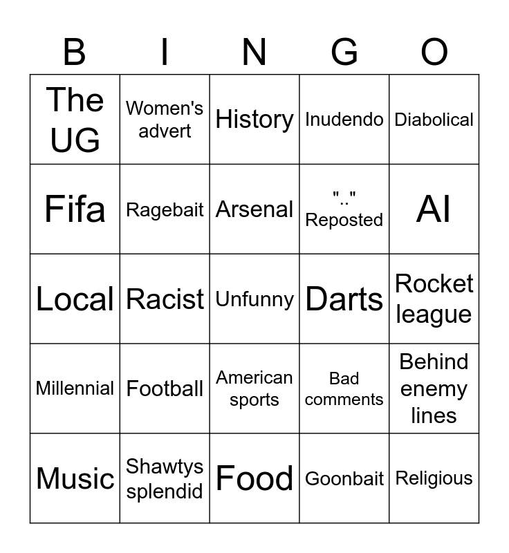 This bingo card has a free space and 24 words: Football, Shawtys splendid, Arsenal, Music, Diabolical, The UG, Fifa, Women's advert, Darts, American sports, ".." Reposted, Local, Bad comments, Behind enemy lines, Ragebait, Goonbait, Rocket league, History, AI, Racist, Religious, Millennial, Inudendo and Food.