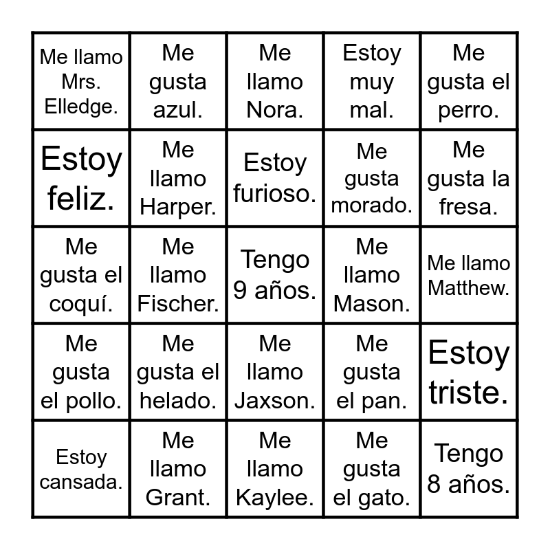 This bingo card has 30 words: Me llamo Grant., Me llamo Stella., Me llamo Fischer., Me llamo Señorita., Me llamo Mrs. Elledge., Me llamo Nora., Me llamo Harper., Me llamo Jaxson., Me llamo Mason., Me llamo Kaylee., Me llamo Matthew., Tengo 9 años., Me gusta el gato., Tengo 8 años., Me gusta la fresa., Me gusta la papa., Me gusta el pan., Me gusta el pollo., Me gusta el helado., Me gusta el perro., Me gusta el coquí., Me gusta rojo., Me gusta azul., Me gusta morado., Estoy feliz., Estoy muy mal., Estoy triste., Estoy cansada., Estoy furioso. and Estoy más or menos..