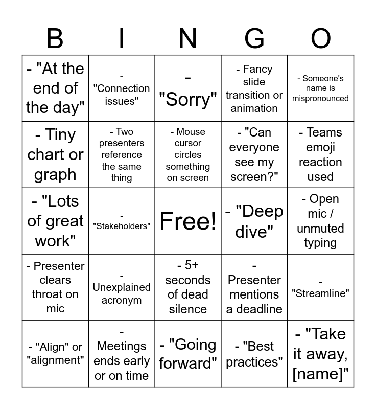 This bingo card has a free space and 35 words: - Wrong screen shared, - Phone ringtone, - Someone drops and rejoins, - Two presenters reference the same thing, - 5+ seconds of dead silence, - Fancy slide transition or animation, - Tiny chart or graph, - Someone makes a pun, - Mouse cursor circles something on screen, - "On that note...", - "Lots of great work", - Someone's name is mispronounced, - "Exciting times", - Background blur glitches on someone's face, - "At the end of the day", - "Deep dive", - "Best practices", - "Stakeholders", - Presenter clears throat on mic, - "Take it away, [name]", - Presenter mentions a deadline, - "Align" or "alignment", - "Streamline", - Meetings ends early or on time, - "Sorry", - Teams emoji reaction used, - "I'll keep this brief", - Screen share fails, - "Can everyone see my screen?", - Open mic / unmuted typing, - Weather reference, - "Going forward", - Unexplained acronym, - "Connection issues" and - "As you can see here...".