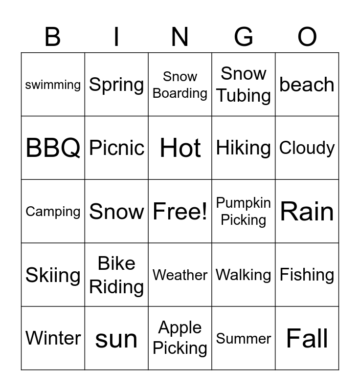 This bingo card has a free space and 26 words: Weather, Summer, Hot, sun, beach, swimming, BBQ, Spring, Rain, Walking, Hiking, Camping, Fishing, Winter, Snow, Cold, Snow Tubing, Skiing, Snow Boarding, Fall, Cloudy, Apple Picking, Pumpkin Picking, Bike Riding, Picnic and Prefer.