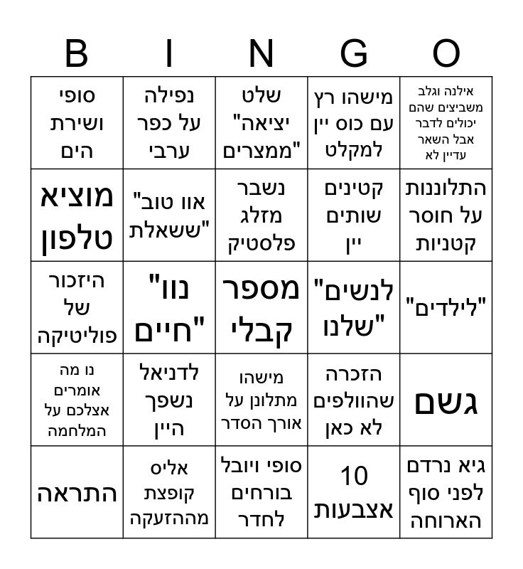 This bingo card has a free space and 29 words: התראה, התראה בלי הזעקה, "נוו חיים", גודל כזית, סופי ושירת הים, שלט "יציאה ממצרים", "אוו טוב ששאלת", לדניאל נשפך היין, "לנשים שלנו", אליס קופצת מההזעקה, "לילדים", גיא נרדם לפני סוף הארוחה, סופי ויובל בורחים לחדר, 10 אצבעות, התלוננות על חוסר קטניות, "מאז שקיבלתי 50 שקל באפיקומן...", מישהו מתלונן על אורך הסדר, נו מה אומרים אצלכם על המלחמה, אילנה וגלב משביצים שהם יכולים לדבר אבל השאר עדיין לא, היזכור של פוליטיקה, הזכרה שהוולפים לא כאן, צוקה נובחת, קטינים שותים יין, מוציא טלפון, מישהו רץ עם כוס יין למקלט, נפילה על כפר ערבי, גשם, נשבר מזלג פלסטיק and מישהו מוציא טלפון.