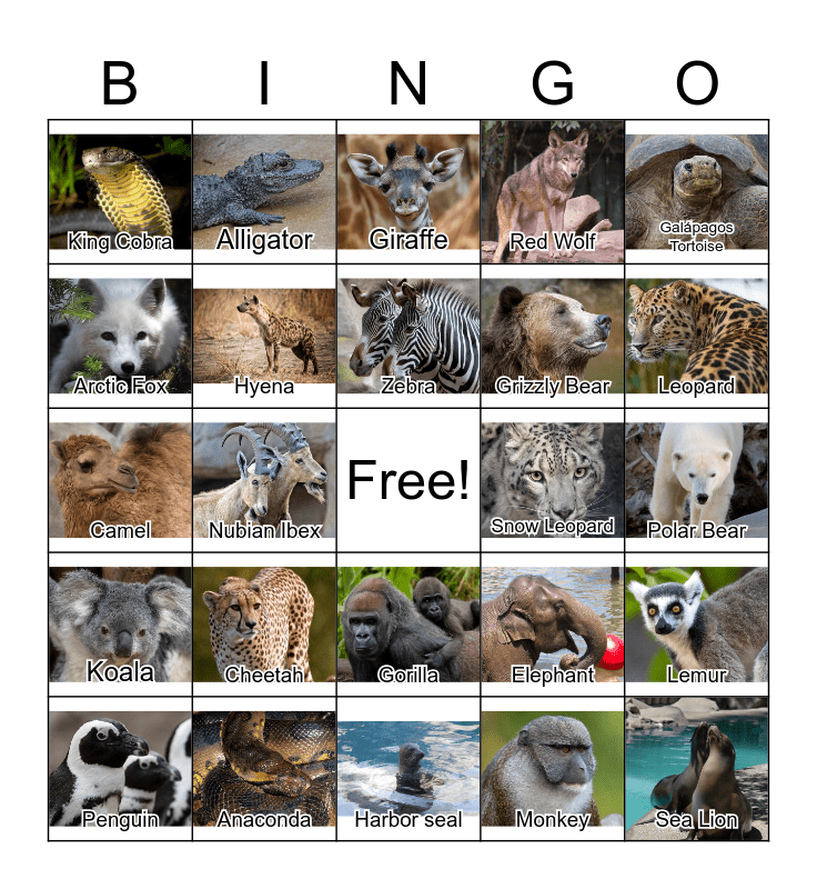 This bingo card has 34 images, a free space and 34 words: Lion, Monkey, Panda, Hippo, Koala, Hyena, Galápagos Tortoise, Penguin, Alligator, Tiger, Zebra, Giraffe, Rhinoceros, Warthog, Snow Leopard, Leopard, Anaconda, Camel, Cheetah, Elephant, Gorilla, Jaguar, King Cobra, Polar Bear, Harbor seal, Sea Lion, Red Wolf, Orangutan, Grizzly Bear, Arctic Fox, African Lion, Nubian Ibex, Lemur and Meerkat.