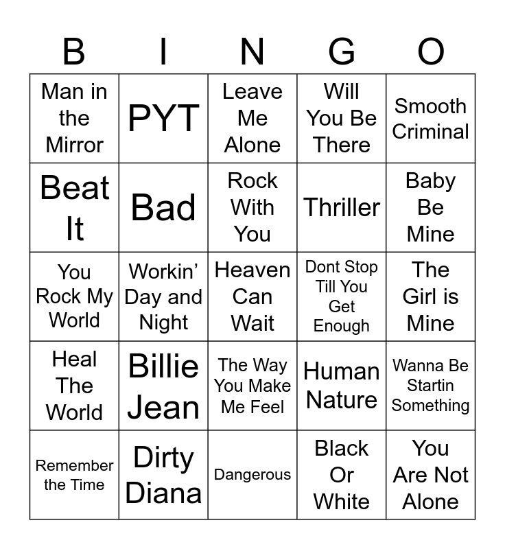 This bingo card has a free space and 24 words: Billie Jean, Dirty Diana, Rock With You, Remember the Time, Smooth Criminal, Man in the Mirror, Beat It, PYT, Dont Stop Till You Get Enough, The Way You Make Me Feel, Thriller, You Rock My World, Human Nature, Wanna Be Startin Something, Bad, Black Or White, The Girl is Mine, Leave Me Alone, Baby Be Mine, Workin’ Day and Night, You Are Not Alone, Heal The World, Will You Be There and Dangerous.