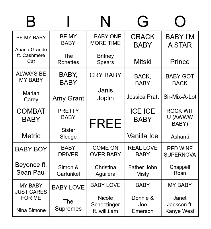 This bingo card has a free space and 28 words: RED WINE SUPERNOVA Chappell Roan, BABY Justin Bieber ft. Ludacris, BACK, BABY Jessica Pratt, BABY Donnie & Joe Emerson, ALWAYS BE MY BABY Mariah Carey, ...BABY ONE MORE TIME Britney Spears, BE MY BABY The Ronettes, BABY BOY Beyonce ft. Sean Paul, ICE ICE BABY Vanilla Ice, MY BABY JUST CARES FOR ME Nina Simone, COMBAT BABY Metric, CRACK BABY Mitski, BABY LOVE The Supremes, BABY LOVE Nicole Scherzinger ft. will.i.am, BABY GOT BACK Sir-Mix-A-Lot, BABY COME BACK Player, BABY DRIVER Simon & Garfunkel, BABY, BABY Amy Grant, CRY BABY Janis Joplin, COME ON OVER BABY Christina Aguilera, BE MY BABY Ariana Grande ft. Cashmere Cat, BABY BE MINE Michael Jackson, MY BABY Janet Jackson ft. Kanye West, PRETTY BABY Sister Sledge, ROCK WIT U (AWWW BABY) Ashanti, REAL LOVE BABY Father John Misty, BABY I'M A STAR Prince and BABY Charli xcx.