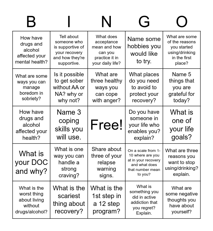 This bingo card has a free space and 24 words: What is one way you can handle a strong craving?, What is the scariest thing about recovery?, What are three healthy ways you can cope with anger?, What is the worst thing about living without drugs/alcohol?, What are some of the reasons you started using/drinking in the first place?, How have drugs and alcohol affected your mental health?, What are some ways you can manage boredom in sobriety?, Tell about someone who is supportive of your recovery and how they're supportive., Do you have someone in your life who enables you? explain?, Share about three of your relapse warning signs., What places do you need to avoid to protect your recovery?, How have drugs and alcohol affected your health?, On a scale from 1-10 where are you at in your recovery and what does that number mean to you?, What are three reasons you want to stop using/drinking? explain., Is it possible to get sober without AA or NA? why or why not?, What is something you did in active addiction that you regret? Explain., What is one of your life goals?, What does acceptance mean and how can you practice it in your daily life?, Name 5 things that you are grateful for today?, Name 3 coping skills you will use., What are some negative thoughts you have about yourself?, What is your DOC and why?, Name some hobbies you would like to try. and What is the 1st step in a 12 step program?.
