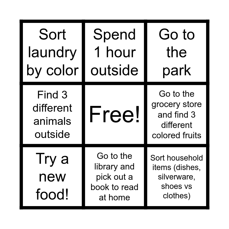 This bingo card has a free space and 8 words: Go to the grocery store and find 3 different colored fruits, Go to the park, Spend 1 hour outside, Try a new food!, Sort laundry by color, Sort household items (dishes, silverware, shoes vs clothes), Find 3 different animals outside and Go to the library and pick out a book to read at home.