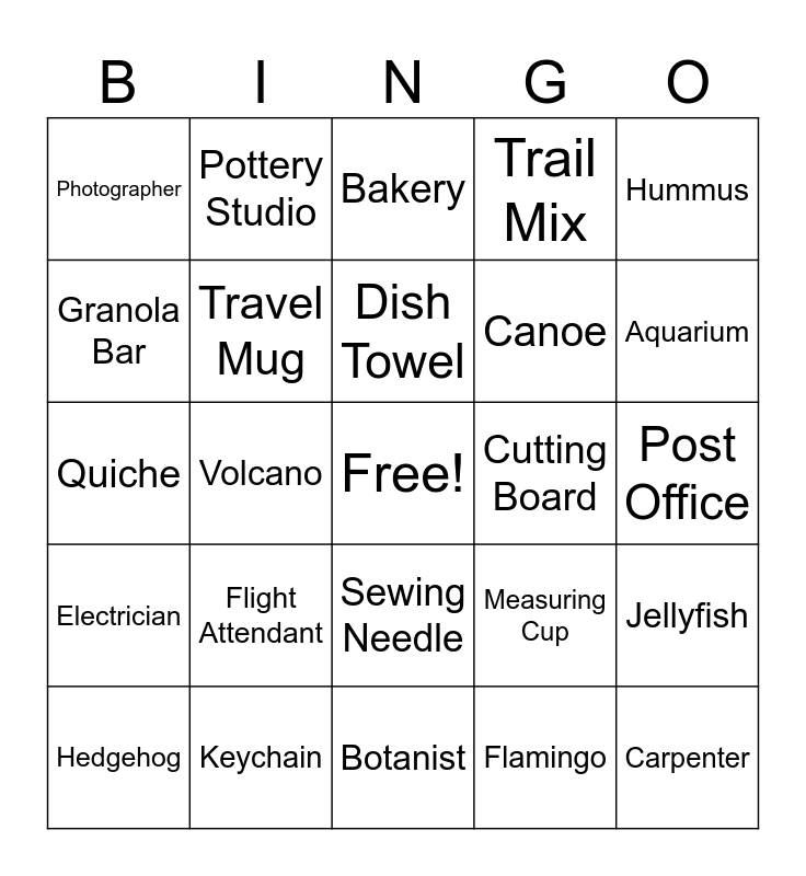 This bingo card has a free space and 29 words: Hedgehog, Raincoat, Volcano, Barista, Photographer, Bakery, Travel Mug, Flight Attendant, Cutting Board, Keychain, Post Office, Carpenter, Botanist, Flamingo, Aquarium, Sun Hat, Sewing Needle, Electrician, Hummus, Quiche, Measuring Cup, Laundry Basket, Canoe, Granola Bar, Trail Mix, Pottery Studio, Jellyfish, Dish Towel and Space Heater.