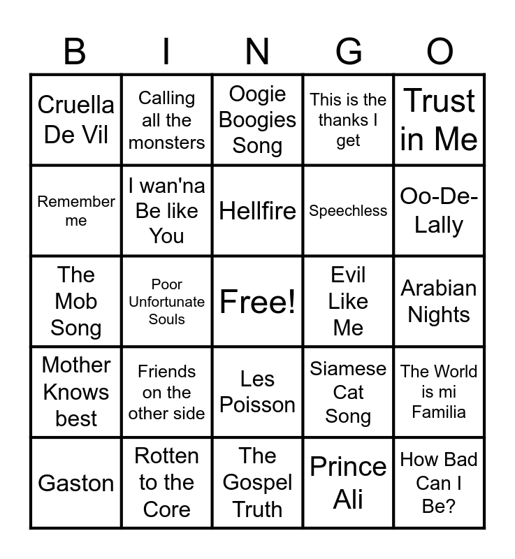 This bingo card has a free space and 29 words: Gaston, Shiny, Poor Unfortunate Souls, Once Upon a Dream, Cruella De Vil, Oogie Boogies Song, I wan'na Be like You, Friends on the other side, Evil Like Me, Rotten to the Core, Arabian Nights, How Bad Can I Be?, The Gospel Truth, Prince Ali, Oo-De-Lally, Yodel-Adle-Eedle-Idle-oo, Les Poisson, Mother Knows best, Trust in Me, The Mob Song, Siamese Cat Song, You're Only Second Best, Speechless, Remember me, This is the thanks I get, Calling all the monsters, The World is mi Familia, Hellfire and Magic Mirror.