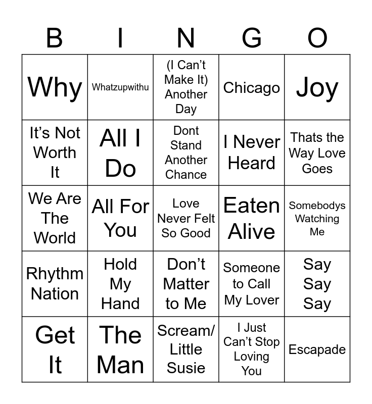 This bingo card has a free space and 24 words: Hold My Hand, The Man, Dont Stand Another Chance, Get It, Joy, Why, It’s Not Worth It, Whatzupwithu, Eaten Alive, Don’t Matter to Me, I Never Heard, We Are The World, Someone to Call My Lover, Say Say Say, All I Do, I Just Can’t Stop Loving You, Somebodys Watching Me, (I Can’t Make It) Another Day, Thats the Way Love Goes, All For You, Escapade, Rhythm Nation, Chicago and Scream/ Little Susie.