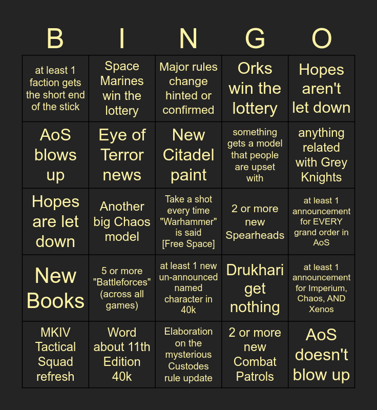 This bingo card has a free space and 24 words: MKIV Tactical Squad refresh, 5 or more "Battleforces" (across all games), New Citadel paint, 2 or more new Combat Patrols, Hopes aren't let down, at least 1 faction gets the short end of the stick, Space Marines win the lottery, Major rules change hinted or confirmed, 2 or more new Spearheads, at least 1 announcement for EVERY grand order in AoS, Hopes are let down, Eye of Terror news, Drukhari get nothing, at least 1 announcement for Imperium, Chaos, AND Xenos, AoS blows up, Word about 11th Edition 40k, Elaboration on the mysterious Custodes rule update, Orks win the lottery, anything related with Grey Knights, New Books, Another big Chaos model, at least 1 new un-announced named character in 40k, something gets a model that people are upset with and AoS doesn't blow up.