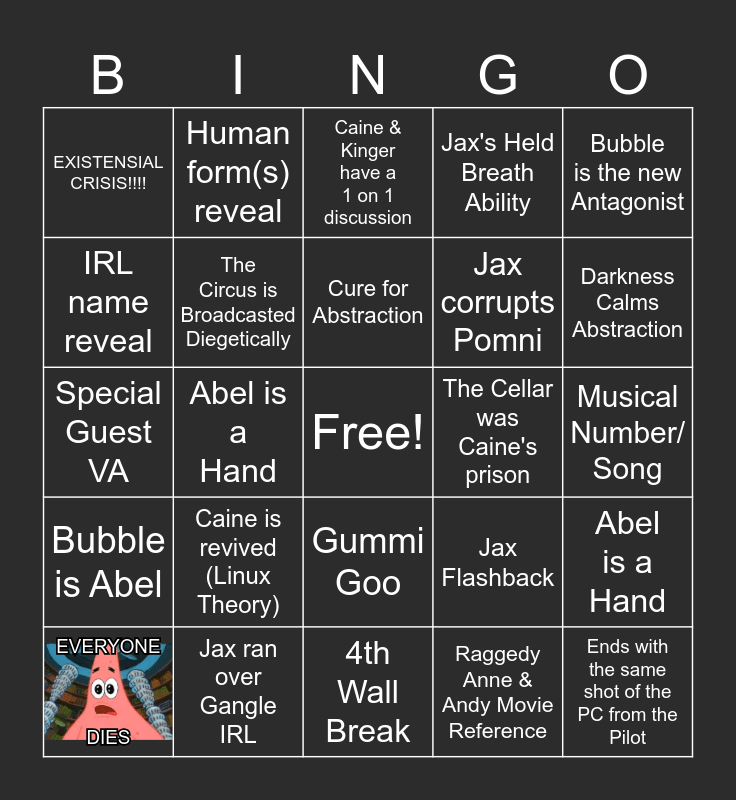 This bingo card has 1 images, a free space and 24 words: Caine is revived (Linux Theory), Jax ran over Gangle IRL, Cure for Abstraction, EVERYONE DIES, Bubble is the new Antagonist, EXISTENSIAL CRISIS!!!!, IRL name reveal, Human form(s) reveal, The Cellar was Caine's prison, Gummi Goo, Jax corrupts Pomni, Special Guest VA, Jax Flashback, Abel is a Hand, The Circus is Broadcasted Diegetically, Raggedy Anne & Andy Movie Reference, Musical Number/ Song, Caine & Kinger have a 1 on 1 discussion, Darkness Calms Abstraction, Abel is a Hand, Ends with the same shot of the PC from the Pilot, Bubble is Abel, Jax's Held Breath Ability and 4th Wall Break.