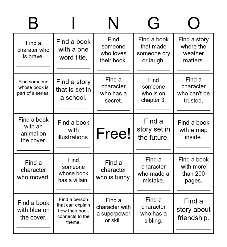 This bingo card has a free space and 24 words: Find someone whose book has a villain. ___________, Find a person that can explain how their book connects to the theme. _____________, Find a character who has a secret. __________, Find a book with blue on the cover. __________, Find a story where the weather matters. __________, Find a charater who is brave. ___________, Find someone whose book is part of a series. _____________, Find a book with a one word title. _________, Find a story set in the future. _________, Find a character who is funny. __________, Find someone who is on chapter 3. ___________, Find a book with an animal on the cover. __________, Find a character who made a mistake. __________, Find a book with more than 200 pages. __________, Find a story that is set in a school. _________, Find a character who has a sibling. __________, Find a book wth a map inside. __________, Find someone who loves their book. __________, Find a character who can't be trusted. __________, Find a book with illustrations. __________, Find a story about friendship. _________, Find a character who moved. __________, Find a book that made someone cry or laugh. __________ and Find a character with a superpower or skill. ___________.