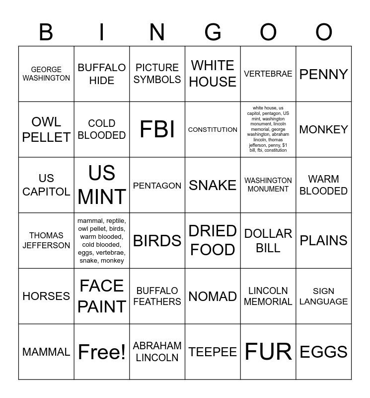 This bingo card has 39 words: Free!, MAMMAL, REPTILE, OWL PELLET, BIRDS, WARM BLOODED, COLD BLOODED, EGGS, VERTEBRAE, SNAKE, MONKEY, WHITE HOUSE, US CAPITOL, PENTAGON, US MINT, WASHINGTON MONUMENT, LINCOLN MEMORIAL, GEORGE WASHINGTON, ABRAHAM LINCOLN, THOMAS JEFFERSON, PENNY, DOLLAR BILL, FBI, CONSTITUTION, TEEPEE, BUFFALO FEATHERS, HORSES, FUR, FACE PAINT, BUFFALO HIDE, MOCASSINS, SIGN LANGUAGE, PICTURE SYMBOLS, DRIED FOOD, PLAINS, NOMAD, mammal, reptile, owl pellet, birds, warm blooded, cold blooded, eggs, vertebrae, snake, monkey, white house, us capitol, pentagon, US mint, washington monument, lincoln memorial, george washington, abraham lincoln, thomas jefferson, penny, $1 bill, fbi, constitution and teepee, buffalo, feathers, horses, fur, face paint, buffalo hide, moccasins, sign language, picture symbols, dried foods, plains, nomad.