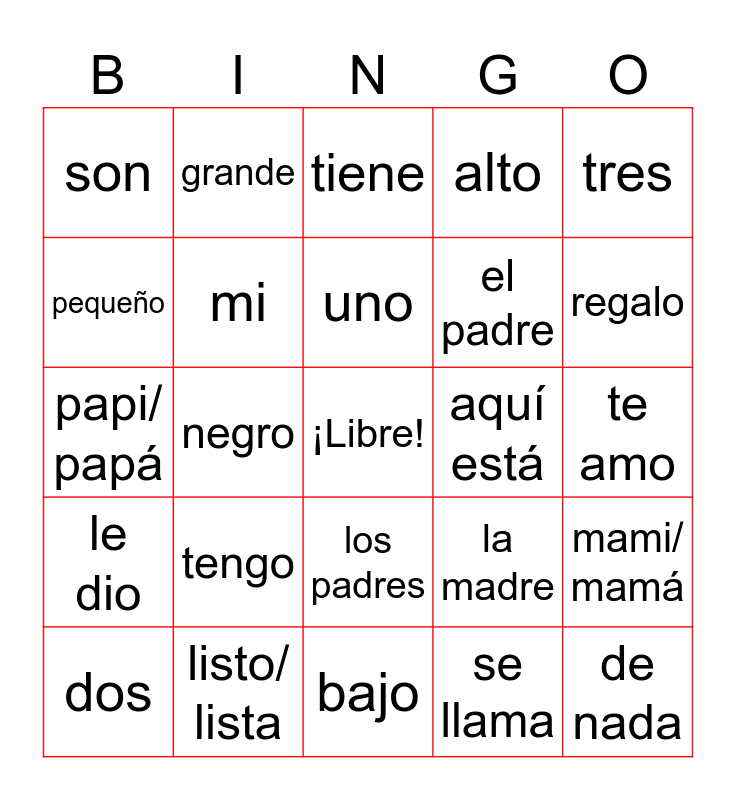 This bingo card has a free space and 24 words: tengo, listo/ lista, uno, dos, tres, son, pequeño, grande, aquí está, los padres, el padre, papi/ papá, la madre, mami/ mamá, mi, se llama, te amo, tiene, regalo, negro, de nada, le dio, alto and bajo.