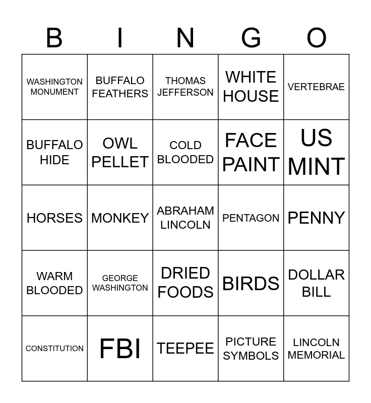 This bingo card has 36 words: Free!, MAMMAL, REPTILE, OWL PELLET, BIRDS, WARM BLOODED, COLD BLOODED, EGGS, VERTEBRAE, SNAKE, MONKEY, WHITE HOUSE, US CAPITAL, PENTAGON, US MINT, WASHINGTON MONUMENT, LINCOLN MEMORIAL, GEORGE WASHINGTON, ABRAHAM LINCOLN, THOMAS JEFFERSON, PENNY, DOLLAR BILL, FBI, CONSTITUTION, TEEPEE, BUFFALO FEATHERS, HORSES, FUR, FACE PAINT, BUFFALO HIDE, MOCCASINS, SIGN LANGUAGE, PICTURE SYMBOLS, DRIED FOODS, PLAINS and NOMAD.