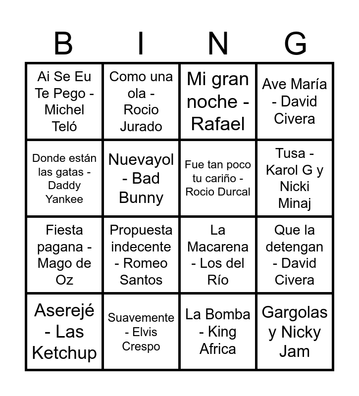 This bingo card has 40 words: Free!, La Macarena - Los del Río, Paquito el Chocolatero - Alan Duffy, Fue tan poco tu cariño - Rocio Durcal, YMCA - Village People, Samba do Brasil - Bellini, Tusa - Karol G y Nicki Minaj, Gasolina - Daddy Yankee, Donde están las gatas - Daddy Yankee, Gargolas y Nicky Jam, Que la detengan - David Civera, Ave María - David Civera, Aserejé - Las Ketchup, La Bomba - King Africa, Suavemente - Elvis Crespo, Corazón Partío - Alejandro Sanz, La mujer de verde - Izal, Ai Se Eu Te Pego - Michel Teló, La Gozadera - Gente de Zona, Mi gran noche - Rafael, Torero - Chayanne, Rayos de sol - Henry Mendez y José de Rico, Fiesta pagana - Mago de Oz, Nuevayol - Bad Bunny, Si antes te hubiera conocido - Karol G, La bachata - Manuel Turizo, Bailar pegados - Sergio Dalma, Limbo - Daddy Yankee, La bicicleta - Carlos Vives y Shakira, Hablame de ti - Los Pecos, Me rehúso - Danny Ocean, La Perla - Rosalia, Vente pa’ ca - Ricky Martin, Échame la culpa - Luis Fonsi, Propuesta indecente - Romeo Santos, Que te den - Amparanoia, Dos hombres y un destino - Bustamante y Alex Casademunt, Se me enamora el alma - Isabel Pantoja, Como una ola - Rocio Jurado and Escondidos - Chenoa y Bisbal.