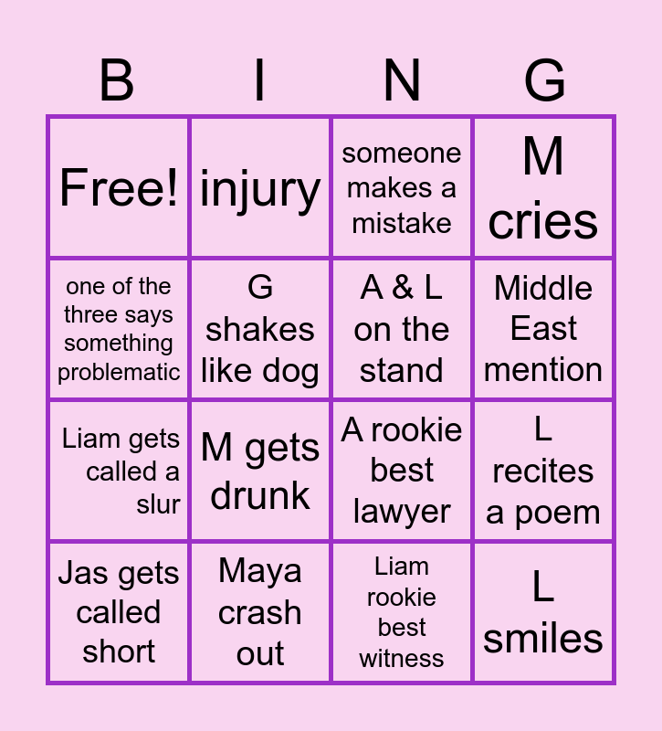 This bingo card has 16 words: Jas gets called short, Maya crash out, someone makes a mistake, M cries, one of the three says something problematic, injury, A rookie best lawyer, L recites a poem, Free!, G shakes like dog, Liam rookie best witness, Middle East mention, Liam gets called a slur, M gets drunk, A & L on the stand and L smiles.