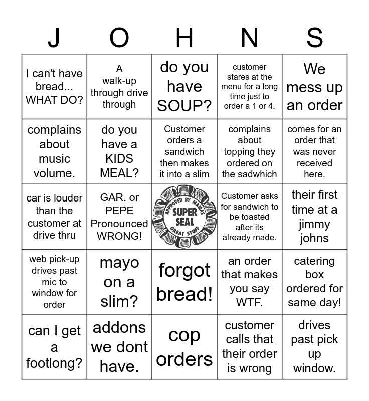 This bingo card has a free space and 29 words: can I get a footlong?, Pickle chips?!, GAR. or PEPE Pronounced WRONG!, creating a sandwich that is already on the menu., I can't have bread... WHAT DO?, do you have SOUP?, do you have a KIDS MEAL?, mayo on a slim?, Customer asks for sandwich to be toasted after its already made., addons we dont have., their first time at a jimmy johns, drives past pick up window., cop orders, customer calls that their order is wrong, comes for an order that was never received here., asks for extra freebies on the side after the order is made, forgot bread!, web pick-up drives past mic to window for order, We mess up an order, car is louder than the customer at drive thru, an order that makes you say WTF., card declines after customer leaves, complains about topping they ordered on the sadwhich, complains about music volume., customer stares at the menu for a long time just to order a 1 or 4., A walk-up through drive through, catering box ordered for same day!, Customer orders a sandwich then makes it into a slim and customer leaves ridiculous requests on web order in comment section..