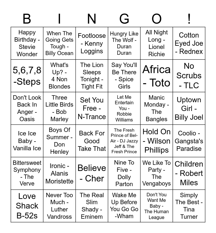 This bingo card has 36 words: Nine To Five - Dolly Parton, Believe - Cher, Wake Me Up Before You Go Go -Wham, 5,6,7,8 -Steps, Ice Ice Baby - Vanilla Ice, Let Me Entertain You - Robbie Williams, What's Up? - 4 Non Blondes, The Real Slim Shady - Eminem, All Night Long - Lionel Richie, We Like To Party - The Vengaboys, No Scrubs - TLC, Hungry Like The Wolf - Duran Duran, Children - Robert Miles, Three Little Birds - Bob Marley, Say You'll Be There - Spice Girls, Happy Birthday - Stevie Wonder, Bittersweet Symphony - The Verve, Manic Monday - The Bangles, Don't Look Back In Anger - Oasis, Footloose - Kenny Loggins, Set You Free - N-Trance, Boys Of Summer - Don Henley, The Fresh Prince of Bel-Air - DJ Jazzy Jeff & The Fresh Prince, Back For Good Take That, Hold On - Wilson Phillips, When The Going Gets Tough - Billy Ocean, Africa - Toto, Never Too Much - Luther Vandross, The Lion Sleeps Tonight - Tight Fit, Cotton Eyed Joe - Rednex, Simply The Best - Tina Turner, Love Shack B-52s, Coolio - Gangsta's Paradise, Uptown Girl - Billy Joel, Ironic - Alanis Moristette and Don't You Want Me Baby - The Human League.