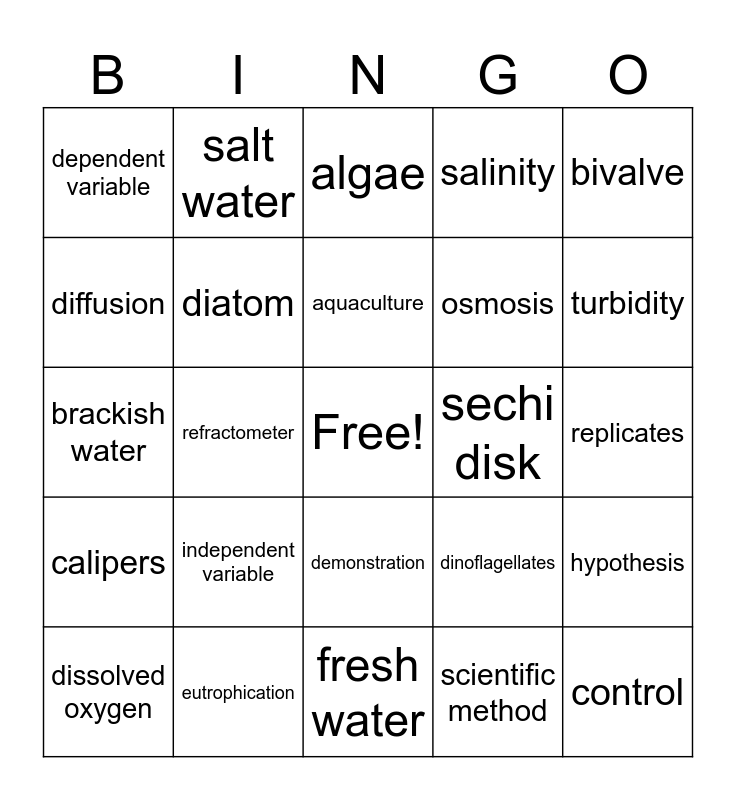 This bingo card has a free space and 36 words: zooplankton, phytoplankton, copepod, diatom, dinoflagellates, calipers, aquaculture, eel grass, bivalve, scallops, refractometer, salinity, pH, sechi disk, turbidity, dependent variable, experiment, independent variable, control, algae, replicates, hypothesis, eutrophication, dissolved oxygen, fresh water, salt water, brackish water, temperature, osmosis, diffusion, clarity, water quality, scientific method, demonstration, constants and conclusion.