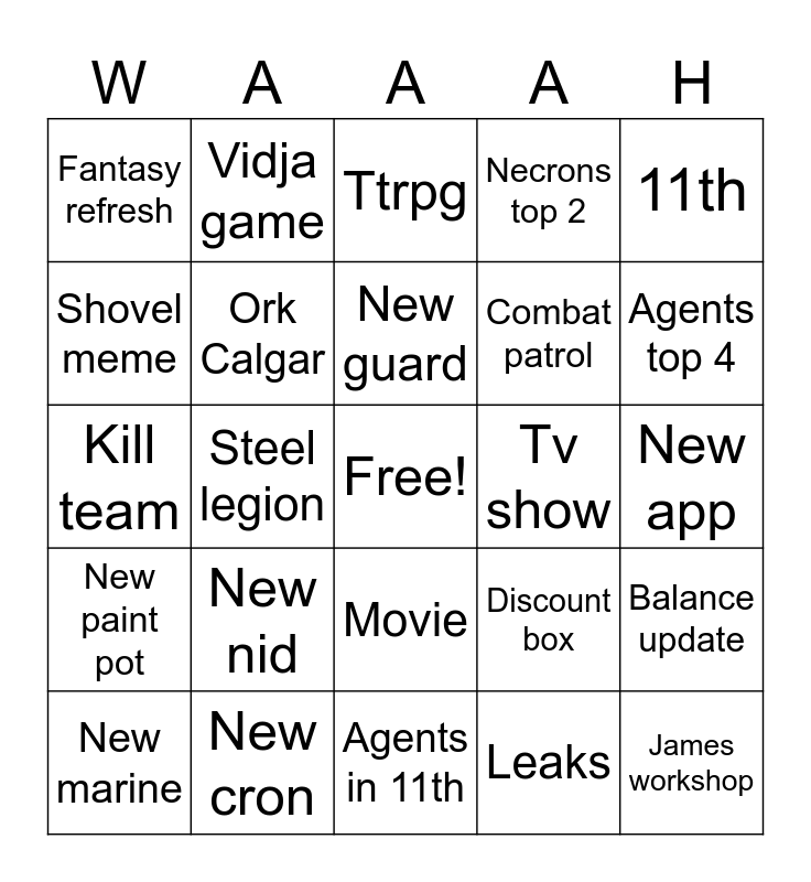 This bingo card has a free space and 24 words: New nid, New cron, New guard, New marine, 11th, Fantasy refresh, Shovel meme, Vidja game, Tv show, Movie, Combat patrol, Kill team, Discount box, Balance update, Ork Calgar, Leaks, New app, Ttrpg, Agents top 4, Steel legion, James workshop, New paint pot, Necrons top 2 and Agents in 11th.