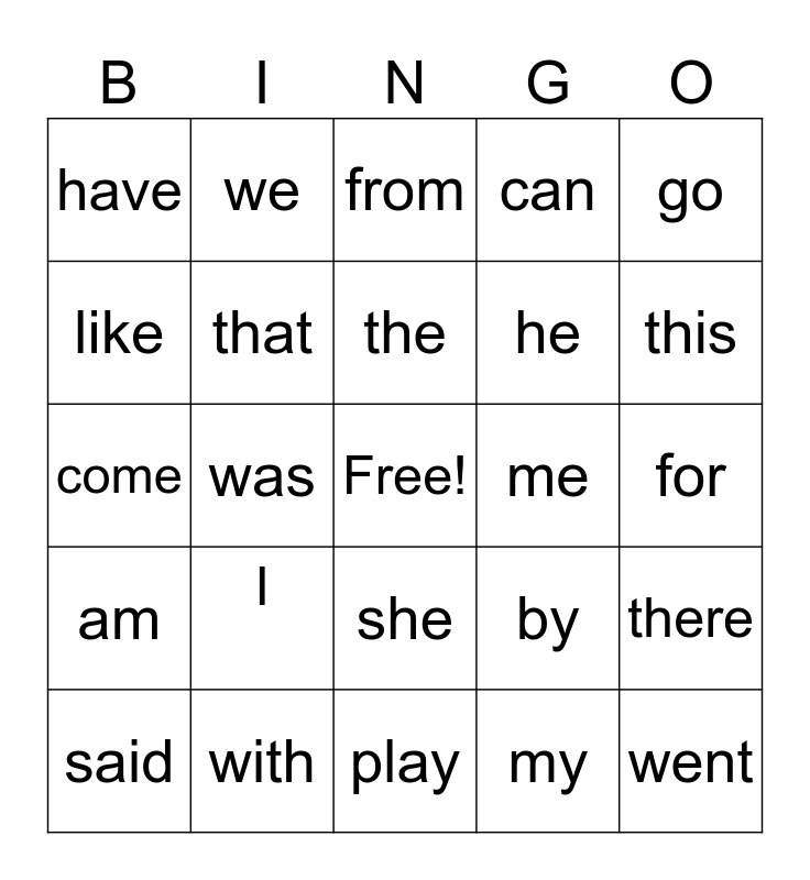This bingo card has a free space and 25 words: I, play, the, said, go, have, like, we, me, she, he, come, by, there, that, see, for, from, this, was, went, with, am, can and my.