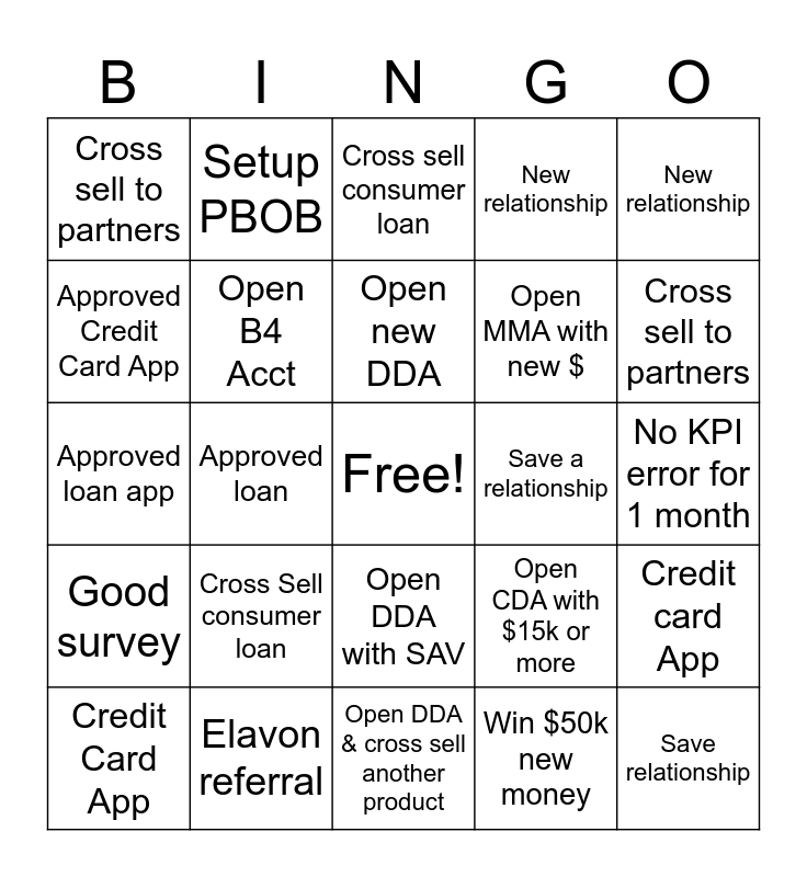 This bingo card has a free space and 24 words: Cross Sell consumer loan, Elavon referral, Open new DDA, Credit Card App, New relationship, Cross sell to partners, Approved Credit Card App, Setup PBOB, Save a relationship, Open DDA with SAV, Open MMA with new $, Approved loan app, Open CDA with $15k or more, Credit card App, Open B4 Acct, Win $50k new money, No KPI error for 1 month, Cross sell consumer loan, Cross sell to partners, Approved loan, Save relationship, Good survey, New relationship and Open DDA & cross sell another product.