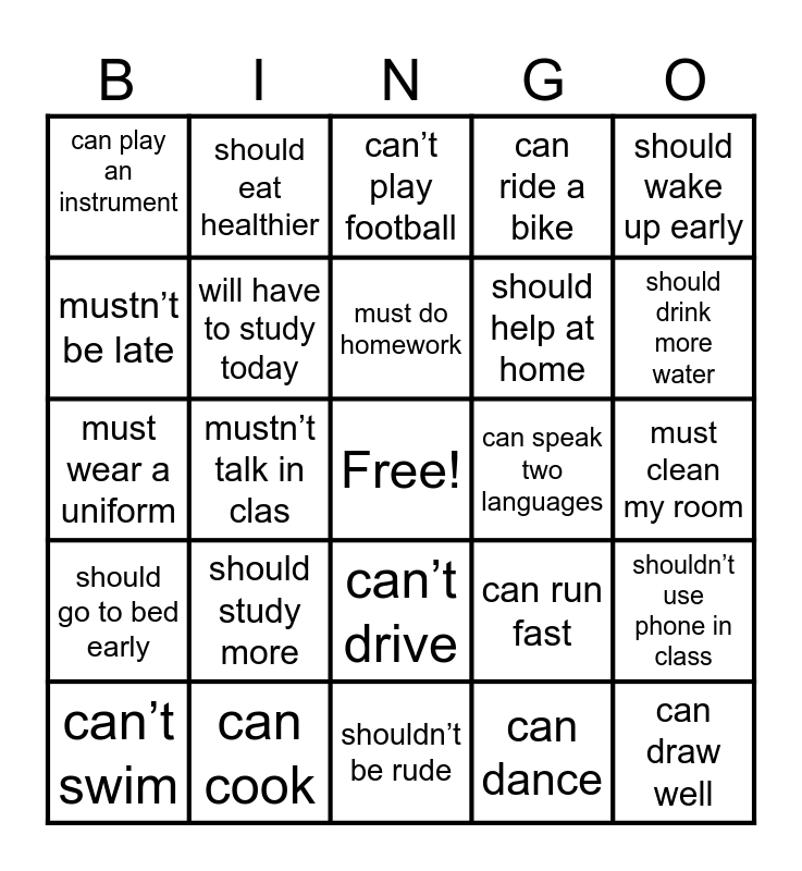 This bingo card has a free space and 24 words: should study more, can cook, must do homework, can’t swim, should wake up early, can play an instrument, mustn’t be late, should eat healthier, can speak two languages, can’t drive, should help at home, must wear a uniform, can run fast, shouldn’t use phone in class, will have to study today, can dance, must clean my room, can’t play football, should drink more water, mustn’t talk in clas, can draw well, should go to bed early, can ride a bike and shouldn’t be rude.