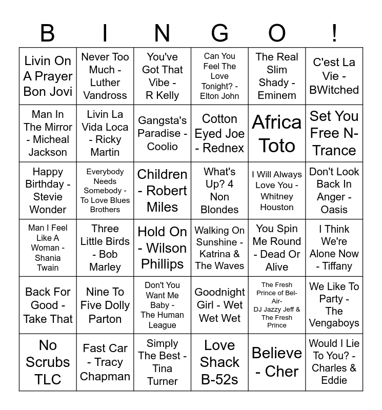This bingo card has 36 words: Goodnight Girl - Wet Wet Wet, Don't You Want Me Baby - The Human League, Love Shack B-52s, Man In The Mirror - Micheal Jackson, Man I Feel Like A Woman - Shania Twain, What's Up? 4 Non Blondes, Livin La Vida Loca - Ricky Martin, Simply The Best - Tina Turner, The Real Slim Shady - Eminem, The Fresh Prince of Bel-Air- DJ Jazzy Jeff & The Fresh Prince, Set You Free N-Trance, Can You Feel The Love Tonight? - Elton John, We Like To Party - The Vengaboys, Everybody Needs Somebody - To Love Blues Brothers, Cotton Eyed Joe - Rednex, Livin On A Prayer Bon Jovi, Back For Good - Take That, I Will Always Love You - Whitney Houston, Happy Birthday - Stevie Wonder, You've Got That Vibe - R Kelly, Children - Robert Miles, Three Little Birds - Bob Marley, Walking On Sunshine - Katrina & The Waves, Hold On - Wilson Phillips, You Spin Me Round - Dead Or Alive, Never Too Much - Luther Vandross, Africa Toto, Fast Car - Tracy Chapman, Gangsta's Paradise - Coolio, C'est La Vie - BWitched, Would I Lie To You? - Charles & Eddie, No Scrubs TLC, I Think We're Alone Now - Tiffany, Don't Look Back In Anger - Oasis, Nine To Five Dolly Parton and Believe - Cher.