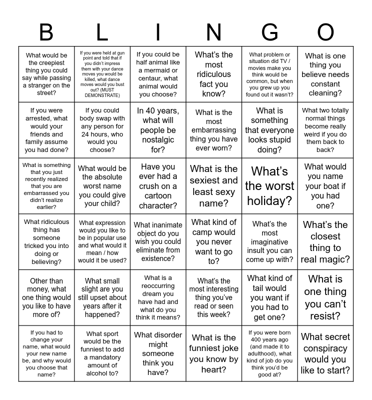 This bingo card has 56 words: Free!, What inanimate object do you wish you could eliminate from existence?, What is the most wasteful way you spend money?, What would be the creepiest thing you could say while passing a stranger on the street?, What’s the most imaginative insult you can come up with?, What kind of crazy ad campaign would you like to see a company run? Even if it means driving the company into the ground., If you were arrested, what would your friends and family assume you had done?, If you could hold a public position, what would it be?, In 40 years, what will people be nostalgic for?, What’s the most useless talent you have?, What’s the most ridiculous fact you know?, What secret conspiracy would you like to start?, What kind of tail would you want if you had to get one?, What’s the most interesting thing you’ve read or seen this week?, If you could know the absolute and total truth to one question, what question would you ask?, What is one thing you can’t resist?, What problem or situation did TV / movies make you think would be common, but when you grew up you found out it wasn’t?, What two totally normal things become really weird if you do them back to back?, What style of dance would you like to master?, What is something that you just recently realized that you are embarrassed you didn’t realize earlier?, What would be the absolute worst name you could give your child?, If you had to change your name, what would your new name be, and why would you choose that name?, What ridiculous thing has someone tricked you into doing or believing?, If you could be half animal like a mermaid or centaur, what animal would you choose?, Which body part do you wish you could detach and why?, If you could body swap with any person for 24 hours, who would you choose?, What is a reoccurring dream you have had and what do you think it means?, What would be the coolest animal to scale up to the size of a horse?, What is the most embarrassing thing you have ever worn?, What sport would be the funniest to add a mandatory amount of alcohol to?, What would be the worst thing for the government to make illegal?, If you were born 400 years ago (and made it to adulthood), what kind of job do you think you’d be good at?, How many chickens would it take to kill an elephant?, What elaborate prank do you wish you could pull on someone and who?, Have you ever had a crush on a cartoon character?, What is one thing you believe needs constant cleaning?, What is something that everyone looks stupid doing?, If you were wrongfully put into an insane asylum, how would you convince them that you’re actually sane and not just pretending to be sane?, What is the sexiest and least sexy name?, If you were held at gun point and told that if you didn’t impress them with your dance moves you would be killed, what dance moves would you bust out? (MUST DEMONSTRATE), What would you name your boat if you had one?, Other than money, what one thing would you like to have more of?, What is the dumbest way you’ve been injured?, If you were proposed to on a first date, what would make you say ‘yes’?, If you became famous and a city wanted to make a statue of you, what pose would you want to be in?, What’s the worst holiday?, What kind of camp would you never want to go to?, What fictional character is amazing in their book / show / movie, but would be insufferable if you had to deal with them in mundane everyday situations?, What is the funniest joke you know by heart?, What small slight are you still upset about years after it happened?, What’s the closest thing to real magic?, What disorder might someone think you have?, What set of items could you buy that would make the cashier the most uncomfortable?, What movie would be greatly improved if it was made into a musical?, What expression would you like to be in popular use and what would it mean / how would it be used? and What’s the weirdest smell you have ever smelled?.