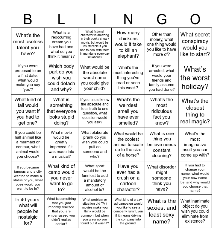 This bingo card has 56 words: Free!, What elaborate prank do you wish you could pull on someone and who?, What style of dance would you like to master?, What’s the most useless talent you have?, What is one thing you believe needs constant cleaning?, What is the most wasteful way you spend money?, If you were proposed to on a first date, what would make you say ‘yes’?, What two totally normal things become really weird if you do them back to back?, What would be the absolute worst name you could give your child?, What is the most embarrassing thing you have ever worn?, How many chickens would it take to kill an elephant?, What inanimate object do you wish you could eliminate from existence?, What disorder might someone think you have?, Have you ever had a crush on a cartoon character?, What set of items could you buy that would make the cashier the most uncomfortable?, If you had to change your name, what would your new name be, and why would you choose that name?, Other than money, what one thing would you like to have more of?, What’s the worst holiday?, If you were wrongfully put into an insane asylum, how would you convince them that you’re actually sane and not just pretending to be sane?, What kind of tail would you want if you had to get one?, What is something that everyone looks stupid doing?, In 40 years, what will people be nostalgic for?, If you could be half animal like a mermaid or centaur, what animal would you choose?, What fictional character is amazing in their book / show / movie, but would be insufferable if you had to deal with them in mundane everyday situations?, What is one thing you can’t resist?, Which body part do you wish you could detach and why?, What sport would be the funniest to add a mandatory amount of alcohol to?, What expression would you like to be in popular use and what would it mean / how would it be used?, What’s the most interesting thing you’ve read or seen this week?, What is something that you just recently realized that you are embarrassed you didn’t realize earlier?, What would be the worst thing for the government to make illegal?, What is the sexiest and least sexy name?, If you were held at gun point and told that if you didn’t impress them with your dance moves you would be killed, what dance moves would you bust out? (MUST DEMONSTRATE), What small slight are you still upset about years after it happened?, If you could know the absolute and total truth to one question, what question would you ask?, What secret conspiracy would you like to start?, If you were arrested, what would your friends and family assume you had done?, What is the dumbest way you’ve been injured?, What’s the weirdest smell you have ever smelled?, What is a reoccurring dream you have had and what do you think it means?, What’s the closest thing to real magic?, If you became famous and a city wanted to make a statue of you, what pose would you want to be in?, What is the funniest joke you know by heart?, What would you name your boat if you had one?, What ridiculous thing has someone tricked you into doing or believing?, What’s the most ridiculous fact you know?, What would be the coolest animal to scale up to the size of a horse?, What would be the creepiest thing you could say while passing a stranger on the street?, What kind of crazy ad campaign would you like to see a company run? Even if it means driving the company into the ground., What kind of camp would you never want to go to?, What’s the most imaginative insult you can come up with?, What problem or situation did TV / movies make you think would be common, but when you grew up you found out it wasn’t?, If you could hold a public position, what would it be?, If you could body swap with any person for 24 hours, who would you choose?, What movie would be greatly improved if it was made into a musical? and If you were born 400 years ago (and made it to adulthood), what kind of job do you think you’d be good at?.