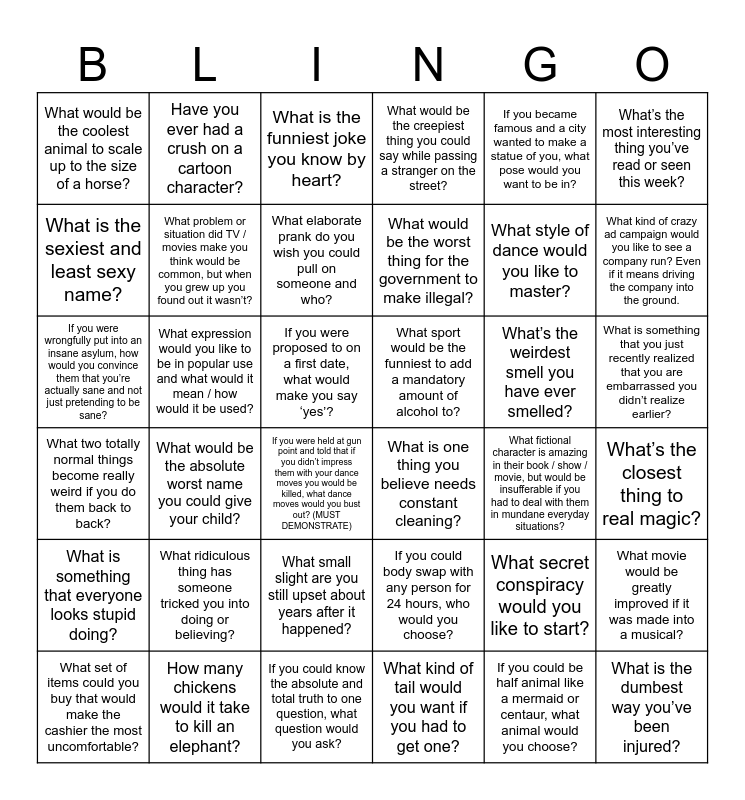 This bingo card has 56 words: Free!, If you were held at gun point and told that if you didn’t impress them with your dance moves you would be killed, what dance moves would you bust out? (MUST DEMONSTRATE), What kind of camp would you never want to go to?, What would be the coolest animal to scale up to the size of a horse?, What fictional character is amazing in their book / show / movie, but would be insufferable if you had to deal with them in mundane everyday situations?, What would you name your boat if you had one?, What is the sexiest and least sexy name?, If you were arrested, what would your friends and family assume you had done?, What elaborate prank do you wish you could pull on someone and who?, What is one thing you can’t resist?, What would be the creepiest thing you could say while passing a stranger on the street?, What is the dumbest way you’ve been injured?, What secret conspiracy would you like to start?, If you could body swap with any person for 24 hours, who would you choose?, What’s the most imaginative insult you can come up with?, What movie would be greatly improved if it was made into a musical?, If you became famous and a city wanted to make a statue of you, what pose would you want to be in?, What kind of crazy ad campaign would you like to see a company run? Even if it means driving the company into the ground., If you were born 400 years ago (and made it to adulthood), what kind of job do you think you’d be good at?, If you were wrongfully put into an insane asylum, how would you convince them that you’re actually sane and not just pretending to be sane?, What expression would you like to be in popular use and what would it mean / how would it be used?, What set of items could you buy that would make the cashier the most uncomfortable?, What two totally normal things become really weird if you do them back to back?, What is the funniest joke you know by heart?, If you could hold a public position, what would it be?, What problem or situation did TV / movies make you think would be common, but when you grew up you found out it wasn’t?, What small slight are you still upset about years after it happened?, What’s the most useless talent you have?, What would be the worst thing for the government to make illegal?, How many chickens would it take to kill an elephant?, If you had to change your name, what would your new name be, and why would you choose that name?, If you could be half animal like a mermaid or centaur, what animal would you choose?, What’s the most ridiculous fact you know?, In 40 years, what will people be nostalgic for?, If you were proposed to on a first date, what would make you say ‘yes’?, What’s the most interesting thing you’ve read or seen this week?, What style of dance would you like to master?, What is the most embarrassing thing you have ever worn?, What sport would be the funniest to add a mandatory amount of alcohol to?, Have you ever had a crush on a cartoon character?, What is something that you just recently realized that you are embarrassed you didn’t realize earlier?, What is something that everyone looks stupid doing?, What inanimate object do you wish you could eliminate from existence?, What’s the worst holiday?, What is the most wasteful way you spend money?, What’s the weirdest smell you have ever smelled?, What is one thing you believe needs constant cleaning?, What is a reoccurring dream you have had and what do you think it means?, What kind of tail would you want if you had to get one?, What ridiculous thing has someone tricked you into doing or believing?, What’s the closest thing to real magic?, If you could know the absolute and total truth to one question, what question would you ask?, Other than money, what one thing would you like to have more of?, What disorder might someone think you have?, What would be the absolute worst name you could give your child? and Which body part do you wish you could detach and why?.