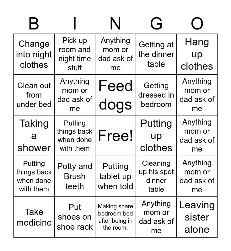 This bingo card has a free space and 24 words: Potty and Brush teeth, Put shoes on shoe rack, Feed dogs, Take medicine, Hang up clothes, Change into night clothes, Clean out from under bed, Pick up room and night time stuff, Putting up clothes, Putting tablet up when told, Getting dressed in bedroom, Taking a shower, Cleaning up his spot dinner table, Anything mom or dad ask of me, Anything mom or dad ask of me, Anything mom or dad ask of me, Anything mom or dad ask of me, Anything mom or dad ask of me, Anything mom or dad ask of me, Putting things back when done with them, Leaving sister alone, Putting things back when done with them, Getting at the dinner table and Making spare bedroom bed after being in the room..