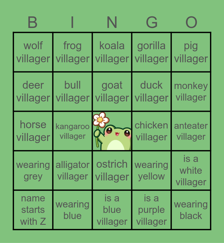This bingo card has a free space and 60 words: hippo villager, alligator villager, bear villager, bear cub villager, anteater villager, bird villager, bull villager, cat villager, chicken villager, cow villager, deer villager, dog villager, duck villager, eagle villager, elephant villager, frog villager, goat villager, gorilla villager, hamster villager, horse villager, kangaroo villager, koala villager, lion villager, monkey villager, mouse villager, octopus villager, ostrich villager, penguin villager, pig villager, rabbit villager, rhino villager, sheep villager, squirrel villager, tiger villager, wolf villager, wearing red, wearing orange, wearing yellow, wearing brown, wearing grey, is a green villager, is a blue villager, is a purple villager, is a pink villager, name starts with A, name starts with F, name starts with K, name starts with P, name starts with U, name starts with Z, wearing blue, wearing purple, wearing pink, wearing black, wearing green, is a red villager, is a orange villager, is a yellow villager, is a white villager and is a brown villager.