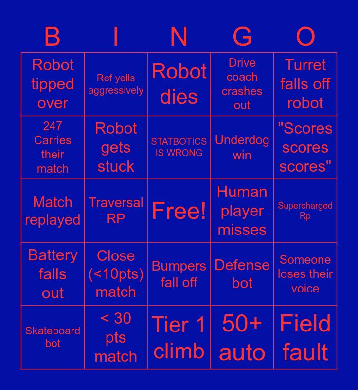 This bingo card has a free space and 31 words: Tier 1 climb, Yellow card, Traversal RP, Pin, Robot tipped over, Robot dies, Robot gets stuck, Defense bot, Human player misses, 50+ auto, Supercharged Rp, Field fault, Line dance, MC makes a bad joke, "Scores scores scores", No show robot, Someone loses their voice, Close (<10pts) match, Battery falls out, Bumpers fall off, Turret falls off robot, Broken intake, Skateboard bot, Ref yells aggressively, Underdog win, 247 Carries their match, Drive coach crashes out, Match replayed, < 30 pts match, STATBOTICS IS WRONG and TBA is off schedule.