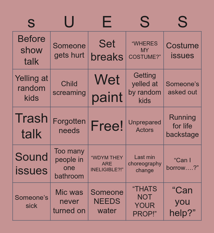 This bingo card has a free space and 34 words: Missed Cues, “THATS NOT YOUR PROP!”, “BE QUIET BACKSTAGE!”, “is that a PHONE?”, Sound issues, Child screaming, Costume issues, Someone’s sick, Someone gets hurt, “WHY IS YOUR MIC OFF?!?”, Wet paint, Set breaks, Crying, Break up, Unprepared Actors, Someone’s asked out, Mic was never turned on, Trash talk, Too many people in one bathroom, Last min choreography change, “WDYM THEY ARE INELIGIBLE?!”, “YOU HAVE SNACKS?”, Before show talk, Running for life backstage, Someone NEEDS water, “Can you help?”, “WHERES MY COSTUME?”, Hair falls out onstage, Getting yelled at by random kids, Yelling at random kids, that group of kids, Forgotten needs, “Can I borrow….?” and Lights mess up.