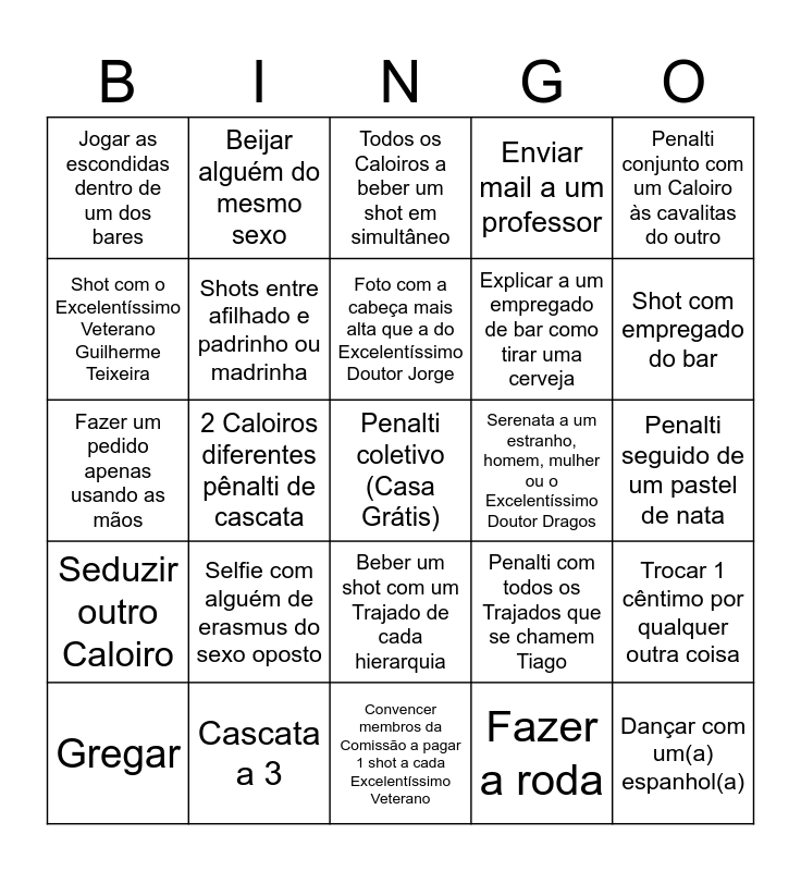 This bingo card has a free space and 24 words: Selfie com alguém de erasmus do sexo oposto, Cascata a 3, Foto com a cabeça mais alta que a do Excelentíssimo Doutor Jorge, Gregar, Penalti conjunto com um Caloiro às cavalitas do outro, Jogar as escondidas dentro de um dos bares, Shot com o Excelentíssimo Veterano Guilherme Teixeira, Beijar alguém do mesmo sexo, Serenata a um estranho, homem, mulher ou o Excelentíssimo Doutor Dragos, Beber um shot com um Trajado de cada hierarquia, Explicar a um empregado de bar como tirar uma cerveja, Fazer um pedido apenas usando as mãos, Penalti com todos os Trajados que se chamem Tiago, Trocar 1 cêntimo por qualquer outra coisa, Shots entre afilhado e padrinho ou madrinha, Fazer a roda, Penalti seguido de um pastel de nata, Todos os Caloiros a beber um shot em simultâneo, Shot com empregado do bar, 2 Caloiros diferentes pênalti de cascata, Dançar com um(a) espanhol(a), Seduzir outro Caloiro, Enviar mail a um professor and Convencer membros da Comissão a pagar 1 shot a cada Excelentíssimo Veterano.