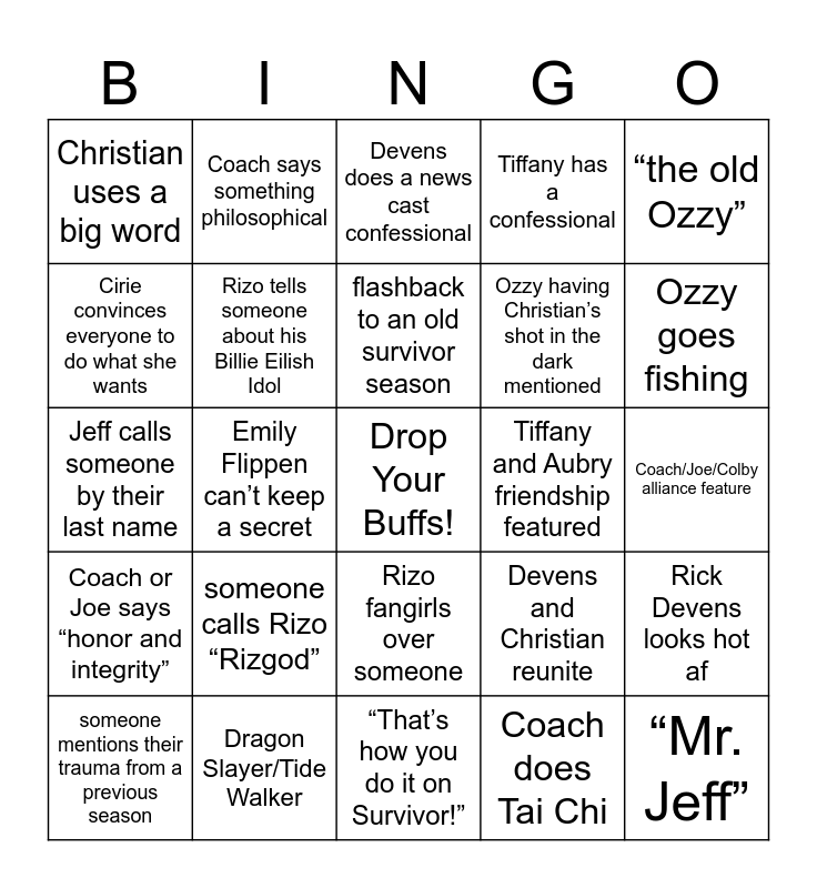 This bingo card has a free space and 24 words: someone calls Rizo “Rizgod”, Dragon Slayer/Tide Walker, flashback to an old survivor season, someone mentions their trauma from a previous season, “the old Ozzy”, Christian uses a big word, Cirie convinces everyone to do what she wants, Coach says something philosophical, Tiffany and Aubry friendship featured, Rizo fangirls over someone, Ozzy having Christian’s shot in the dark mentioned, Jeff calls someone by their last name, Devens and Christian reunite, Rick Devens looks hot af, Rizo tells someone about his Billie Eilish Idol, Coach does Tai Chi, Coach/Joe/Colby alliance feature, Devens does a news cast confessional, Ozzy goes fishing, Emily Flippen can’t keep a secret, “Mr. Jeff”, Coach or Joe says “honor and integrity”, Tiffany has a confessional and “That’s how you do it on Survivor!”.