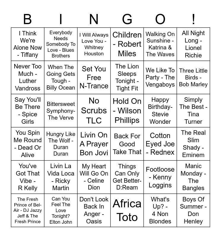 This bingo card has 36 words: Things Can Only Get Better- D:Ream, My Heart Will Go On - Celine Dion, Africa Toto, Never Too Much - Luther Vandross, You Spin Me Round - Dead Or Alive, Hold On - Wilson Phillips, When The Going Gets Tough - Billy Ocean, Don't Look Back In Anger - Oasis, Walking On Sunshine - Katrina & The Waves, Footloose - Kenny Loggins, Three Little Birds - Bob Marley, Children - Robert Miles, Manic Monday - The Bangles, Bittersweet Symphony- The Verve, The Lion Sleeps Tonight - Tight Fit, I Think We're Alone Now - Tiffany, You've Got That Vibe - R Kelly, Happy Birthday- Stevie Wonder, Say You'll Be There - Spice Girls, I Will Always Love You - Whitney Houston, No Scrubs TLC, Hungry Like The Wolf - Duran Duran, Back For Good Take That, Livin On A Prayer Bon Jovi, Cotton Eyed Joe - Rednex, Everybody Needs Somebody To Love - Blues Brothers, We Like To Party - The Vengaboys, Can You Feel The Love Tonight? Elton John, Set You Free N-Trance, All Night Long - Lionel Richie, Boys Of Summer - Don Henley, The Fresh Prince of Bel-Air - DJ Jazzy Jeff & The Fresh Prince, The Real Slim Shady - Eminem, Simply The Best - Tina Turner, Livin La Vida Loca - Ricky Martin and What's Up? - 4 Non Blondes.