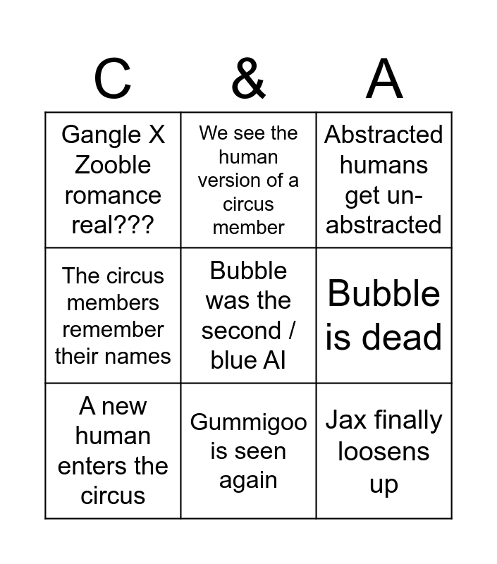 This bingo card has 9 words: A new human enters the circus, Abstracted humans get un-abstracted, We see the human version of a circus member, The circus members remember their names, Gangle X Zooble romance real???, Bubble is dead, Bubble was the second / blue AI, Jax finally loosens up and Gummigoo is seen again.