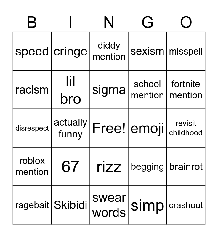 This bingo card has a free space and 24 words: 67, Skibidi, sigma, ragebait, misspell, speed, racism, cringe, emoji, rizz, school mention, disrespect, begging, brainrot, lil bro, simp, revisit childhood, diddy mention, fortnite mention, actually funny, crashout, roblox mention, sexism and swear words.