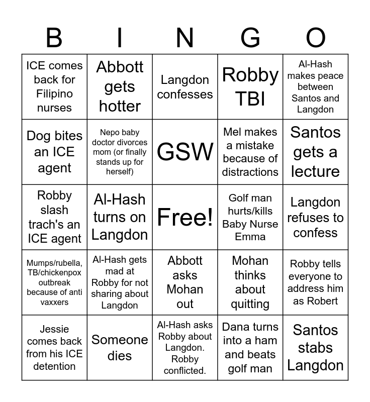 This bingo card has a free space and 24 words: Al-Hash gets mad at Robby for not sharing about Langdon, Someone dies, GSW, Jessie comes back from his ICE detention, Al-Hash makes peace between Santos and Langdon, ICE comes back for Filipino nurses, Dog bites an ICE agent, Abbott gets hotter, Golf man hurts/kills Baby Nurse Emma, Abbott asks Mohan out, Mel makes a mistake because of distractions, Robby slash trach's an ICE agent, Mohan thinks about quitting, Robby tells everyone to address him as Robert, Nepo baby doctor divorces mom (or finally stands up for herself), Dana turns into a ham and beats golf man, Langdon refuses to confess, Langdon confesses, Santos gets a lecture, Al-Hash turns on Langdon, Santos stabs Langdon, Mumps/rubella, TB/chickenpox outbreak because of anti vaxxers, Robby TBI and Al-Hash asks Robby about Langdon. Robby conflicted..