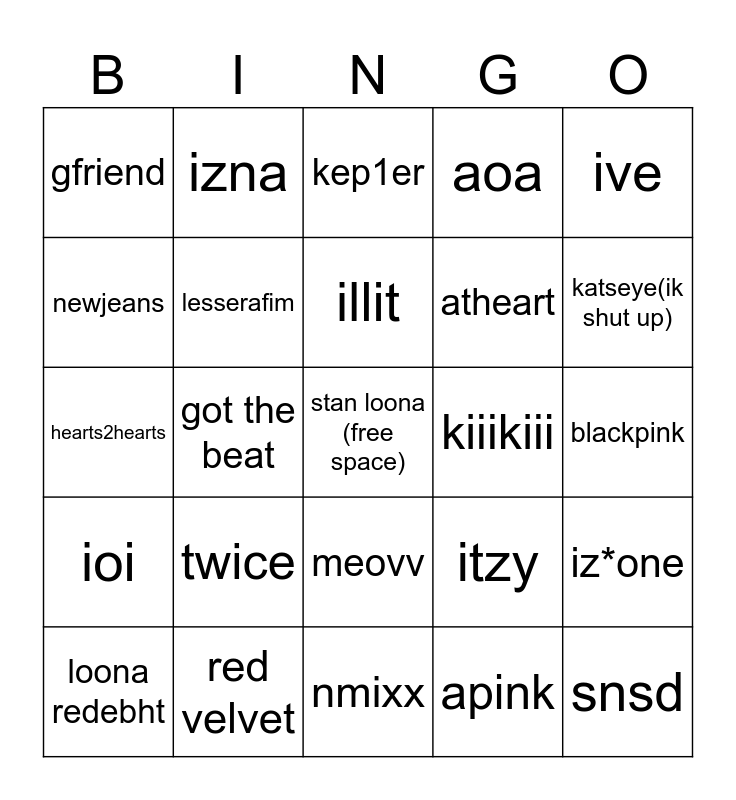 This bingo card has a free space and 24 words: twice, red velvet, illit, loona redebht, ive, gfriend, newjeans, izna, kiiikiii, meovv, atheart, hearts2hearts, itzy, iz*one, lesserafim, apink, blackpink, kep1er, katseye(ik shut up), got the beat, snsd, ioi, aoa and nmixx.