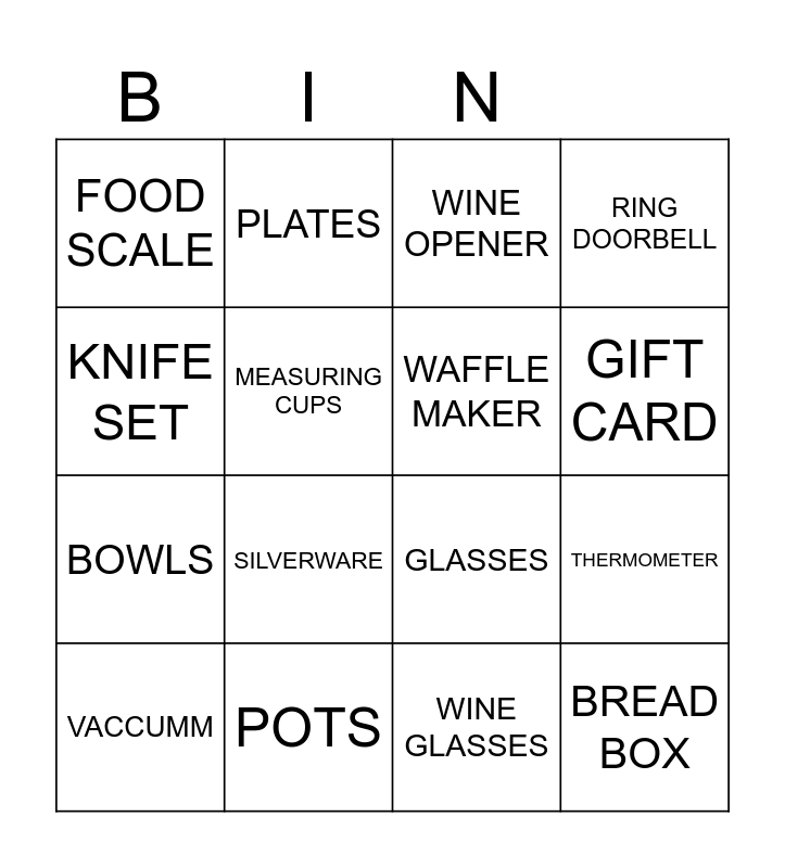 This bingo card has 23 words: BREAD BOX, DUTCH OVEN, GIFT CARD, PANS, KNIFE SET, FOOD SCALE, MEASURING CUPS, PLATES, VACCUMM, CUTTING BOARD, SILVERWARE, BOWLS, CONTAINERS, CASH, POTS, BLENDER, WINE OPENER, GLASSES, WAFFLE MAKER, THERMOMETER, RING DOORBELL, WINE GLASSES and SHOWER HEAD.