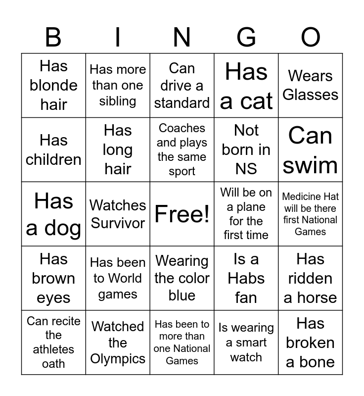 This bingo card has a free space and 24 words: Has been to World games, Watched the Olympics, Coaches and plays the same sport, Can recite the athletes oath, Wears Glasses, Has blonde hair, Has children, Has more than one sibling, Will be on a plane for the first time, Wearing the color blue, Not born in NS, Has a dog, Is a Habs fan, Has ridden a horse, Has long hair, Is wearing a smart watch, Medicine Hat will be there first National Games, Can drive a standard, Can swim, Watches Survivor, Has broken a bone, Has brown eyes, Has a cat and Has been to more than one National Games.