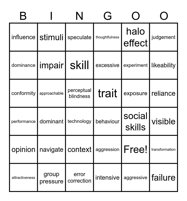This bingo card has 37 words: Free!, aggression, aggressive, dominance, dominant, exposure, impair, intensive, halo effect, attractiveness, likeability, thoughtfulness, conformity, perceptual blindness, judgement, trait, navigate, speculate, reliance, approachable, influence, excessive, technology, social skills, group pressure, visible, stimuli, error correction, transformation, context, precision, behaviour, experiment, opinion, performance, skill and failure.