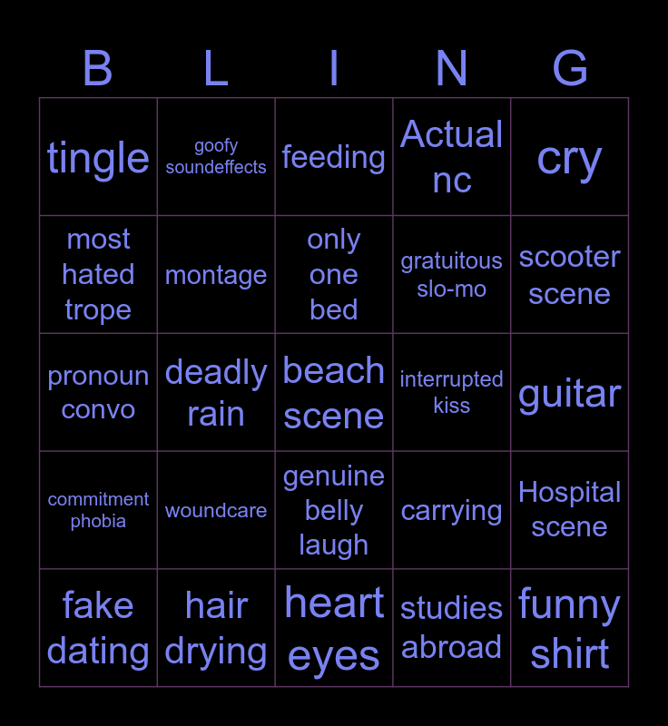 This bingo card has 25 words: woundcare, heart eyes, only one bed, fake dating, cry, tingle, most hated trope, goofy soundeffects, interrupted kiss, genuine belly laugh, gratuitous slo-mo, pronoun convo, carrying, Hospital scene, montage, funny shirt, guitar, feeding, scooter scene, deadly rain, beach scene, hair drying, commitment phobia, Actual nc and studies abroad.