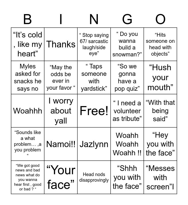This bingo card has a free space and 58 words: How bout them apples”, “Your face”, “Nemo”, “Sounds like a what problem… ,a you problem “, “Shhh you with the face”, “5 additional points”, “May the odds be ever in your favor “, ““, “So we gonna have a pop quiz”, “ Misterrrrr Acostaaaaa”, “ Do you wanna build a snowman?”, “ Language”, “—— move seats with ——“, “I’m evil”, “I’ll be nice today”, “It’s cold , like my heart”, “Messes with screen”I, “Hits someone on head with objects”, “Threatens with yard stick”, “ Taps someone with yardstick”, “ I need a volunteer as tribute”, “ Stop saying 67/ sarcastic laugh/side eye”, “We got good news and bad news what do you wanna hear first , good or bad ? “, “Hey you with the face”, “You ,yeah ,you “, “With that being said”, “We gonna fight”, “Jesse”, “Hush your mouth”, “Say I won’t”, “Love you tho”, “Mmmm”, Sounds like a personal problem, Messes with the Adler, Good luck kiddos, Counts downs from 10, Sighhh, I worry about yall, Woahhh, Namoi, Namoi!!, Namoi!!!!, Woahh Woahh Woahh !!, Be nice, Yes, No, Shakes head, Jazlynn, Head nods disapprovingly, Messes with Will, I’m gonna sit her (Naomi) next to Jess, Again, Alright kiddos, Dnaggg, Thanks, Stop touching each other, Myles asked for snacks he says no and Silence.